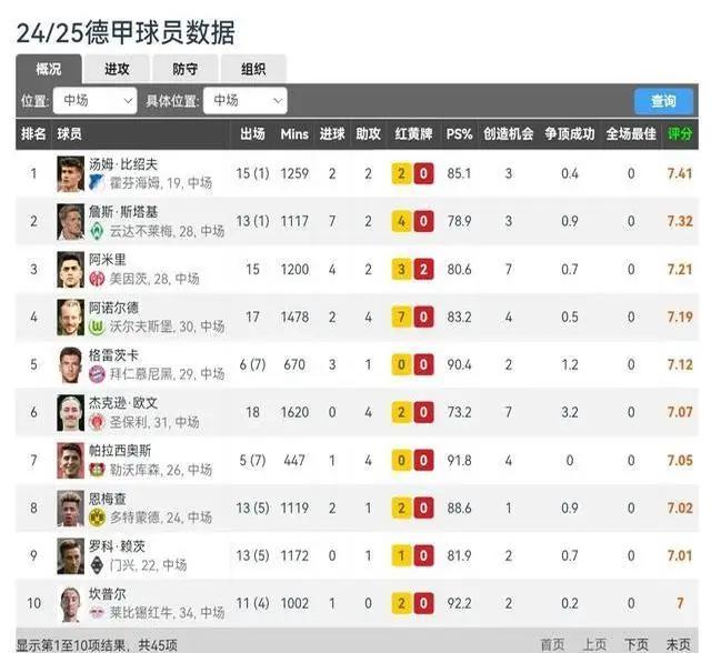 凭着16场比赛场均评分7.41的成绩,拿下了德甲中场评分第一的头衔。