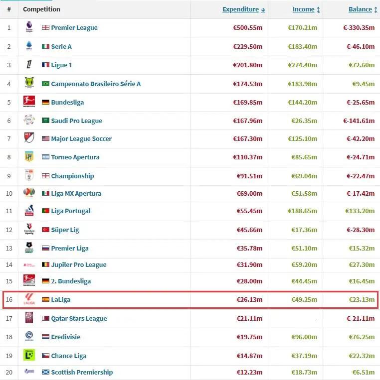 这使得西甲在此次冬窗支出排行中仅位于全球第16,甚至低于英冠、德乙等次级联赛。