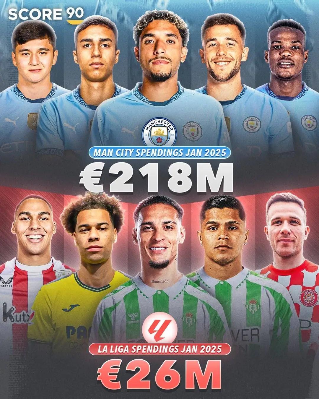 直播吧02月05日讯 2025年冬季转会窗关闭,西甲成为欧洲五大联赛里支出数字最低的联赛,他们支出的转会费甚至不及英超的零头。