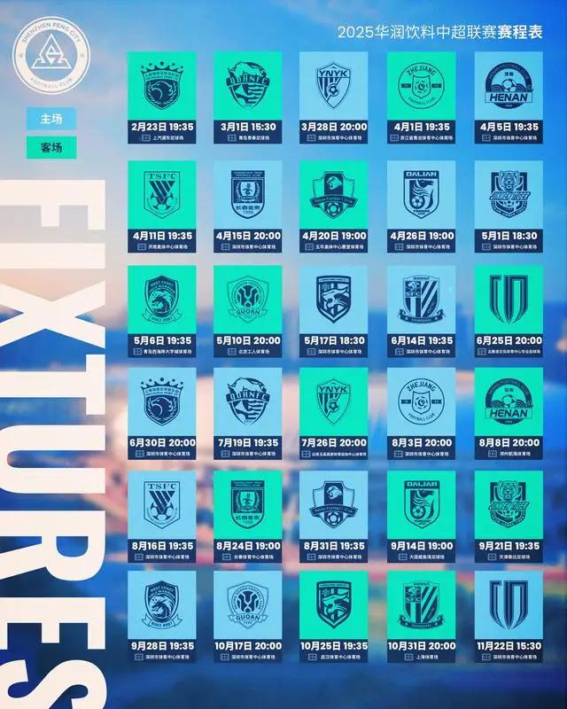 2025赛季中超联赛将于2月22日开幕,11月22日结束,共进行30轮240场比赛较量。近日,深圳新鹏城新赛季赛程表出炉,球队将于2月23日19时35分客场挑战去年中超冠军上海海港;3月28日20时,将在深圳市体育中心体育场打响新赛季首个主场比赛。