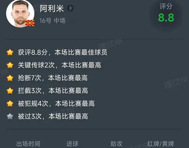 最后,在本赛季的欧洲国家联赛比赛中,阿利米在多个数据上高居北马其顿全队第一,包括传球、抢断、被侵犯、地面争抢和成功地面争抢次数,这些数据都位列欧洲国家联赛所有球员前22名,超过许多五大联赛的巨星,充分显示他的全面实力。