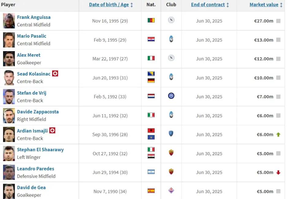 在这批合同即将到期的球员中,身价达到400万欧元以上的有15人,而身价最高的球员是那不勒斯中场安古伊萨,他的市场估值高达2700万欧元。
