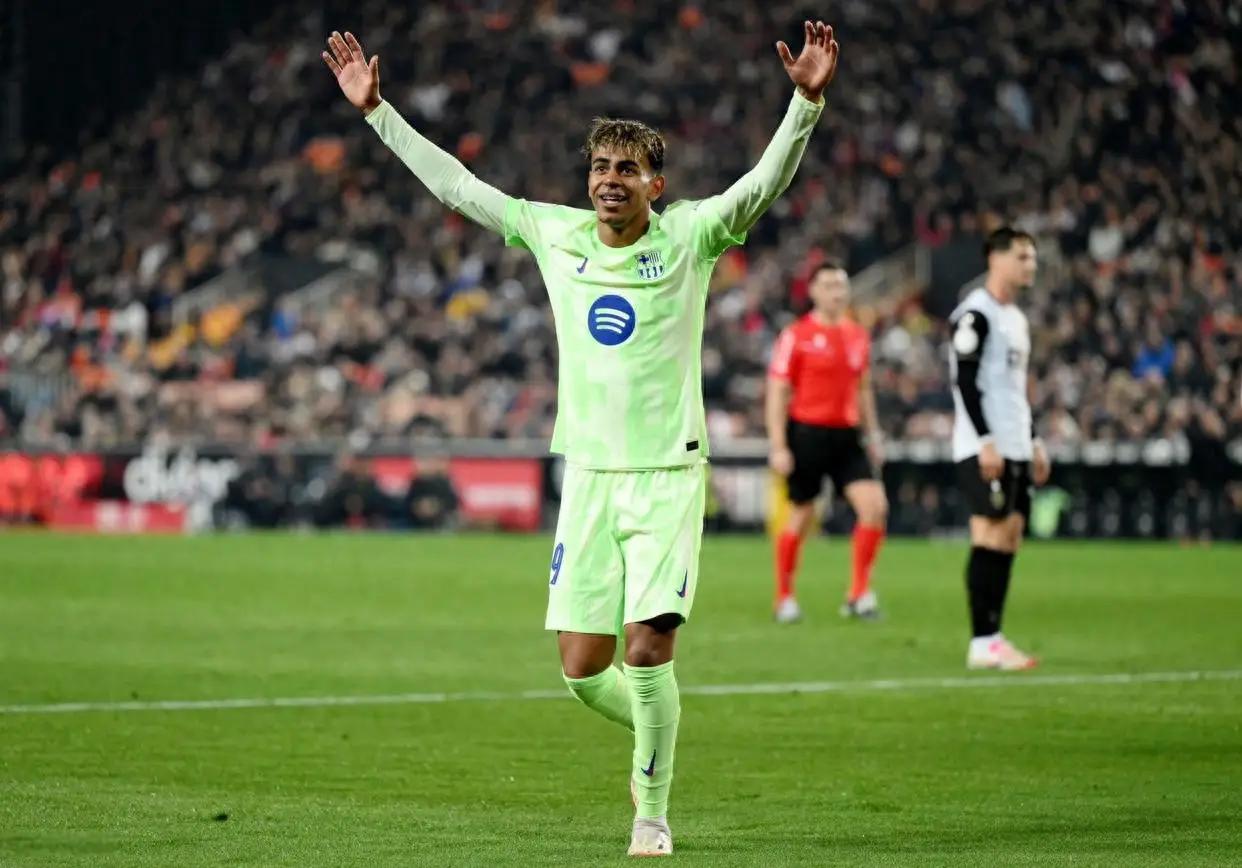 下半场开始后,巴萨依旧掌控局势。第53分钟,亚马尔展示个人技术,右路内切射门,皮球击中立柱弹出。5分钟后,巴萨快速反击,拉菲尼亚传中,亚马尔迎球推射,皮球经过瓦伦西亚后卫折射入网,巴萨以5-0锁定胜局!