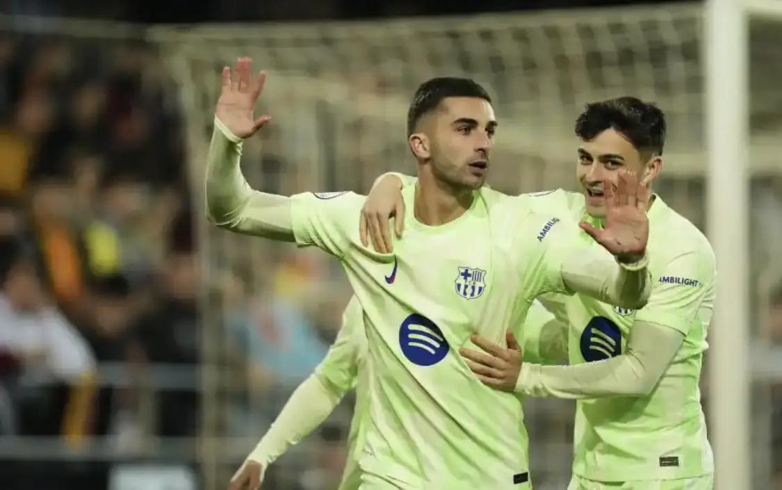 推球网2月7日讯 国王杯赛场,一场焦点之战在巴萨与瓦伦西亚之间激烈上演。比赛中,巴萨前锋费兰宛如一颗璀璨的流星,划过夜空,绽放出耀眼光芒。仅仅半小时,他便以超凡的球技完成了帽子戏法,让全场为之沸腾。