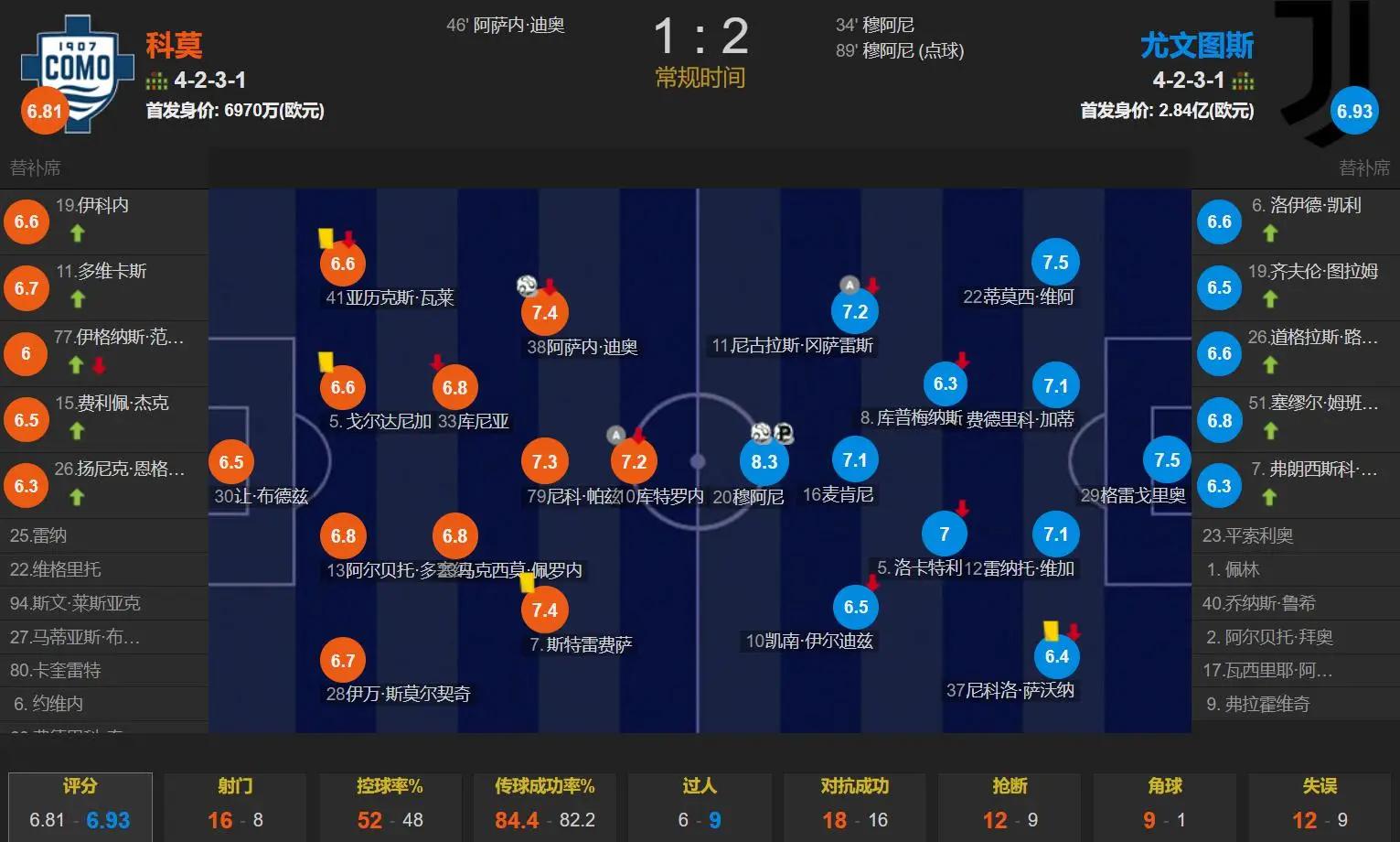 科莫vs尤文,法布雷加斯排出4231阵型,首发身价6970万欧元;莫塔排出4231阵型,穆阿尼突前,身后是麦肯尼,两侧是伊尔迪兹和冈萨雷斯,洛卡特利和库普梅纳斯搭档后腰,萨沃纳、维加、加蒂、维阿组成四后卫,迪格雷戈里奥守门,首发身价2.84亿欧元。
