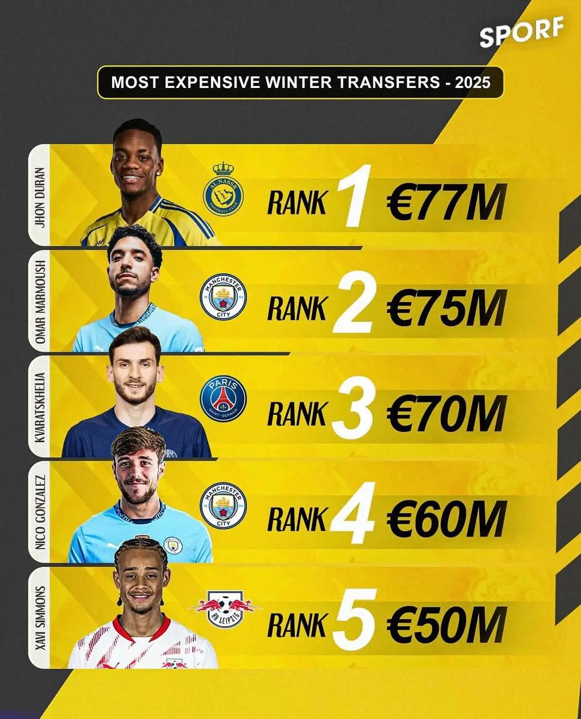 冬季转会窗口期间,各大俱乐部纷纷完成了多笔重量级交易。以下是此次冬窗转会费最高的五项排名: