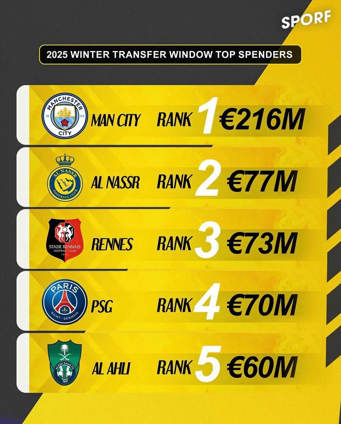 统计数据显示,曼城在冬季转会窗口的总投资达到了惊人的2.16亿欧元,这一数字不仅高居榜首,更是接近其身后所有俱乐部支出总和的三倍。以下是具体排名:
