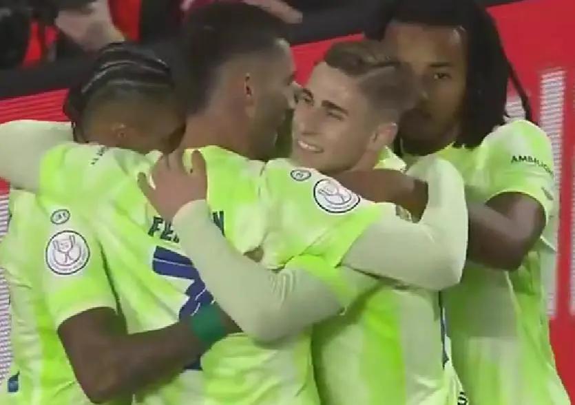 比赛刚开始3分钟,费兰托雷斯接巴尔德传球后突破防线,倒地推射得手,率先破门。随后,费兰托雷斯完成帽子戏法,加上费尔明的入球,巴萨半场就已4-0领先,提前锁定晋级资格。