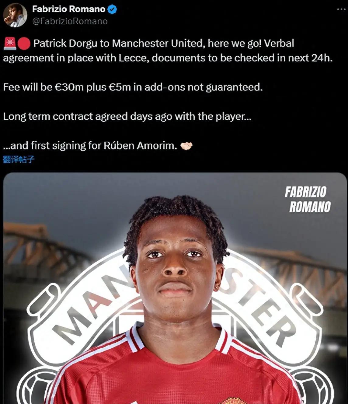 据罗马诺报道,曼联已与莱切达成购买协议,将以3000万欧元固定转会费外加500万欧元浮动条款签下多古。这笔交易的达成,无疑让阿莫林如愿以偿,得到了心仪已久的左翼球员。
