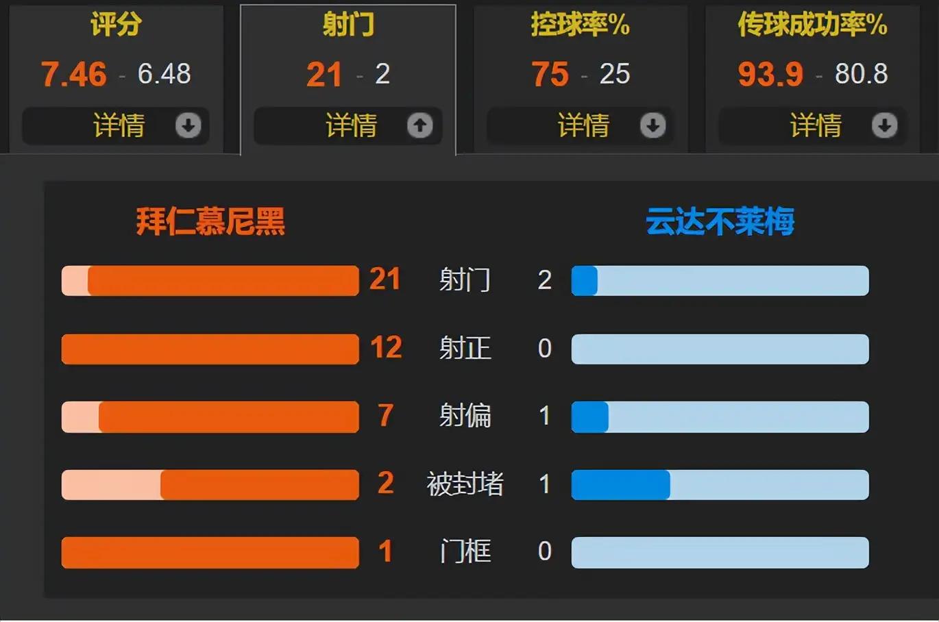 上半场,拜仁9次射门未能取得进球,半场0-0战平;下半场,凯恩点射完成梅开二度,本赛季21个联赛进球领跑德甲积分榜,萨内替补出场1分钟就建功锁定胜局。