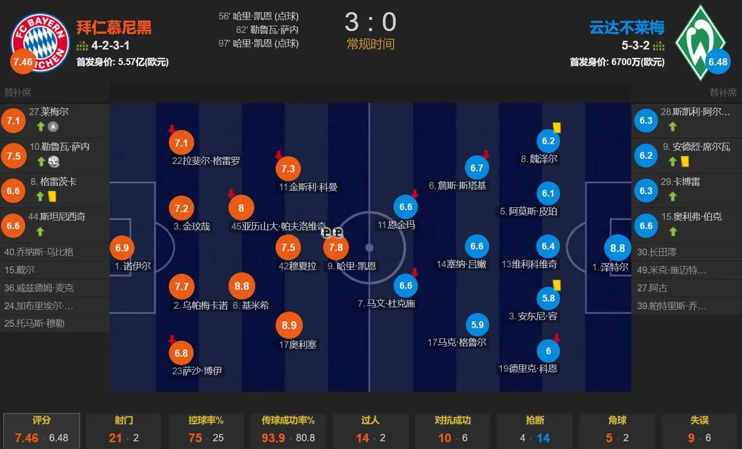 最终,拜仁3-0轻取不莱梅,先赛9分领跑德甲积分榜。