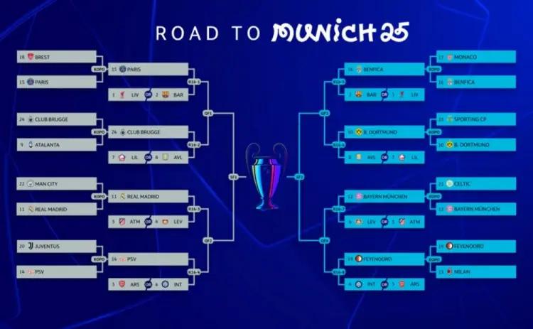 024/25赛季欧冠16强淘汰赛对阵抽签将于北京时间今天晚上19:00进行,抽签地点位于瑞士尼翁。