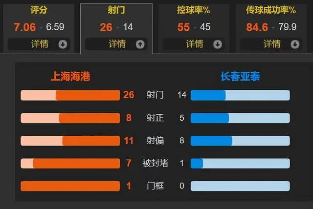 全场比赛,上海海港的控球率为55%,一共有25次射门,其中8次射正;长春亚泰一共有14次射门,其中5次射正。